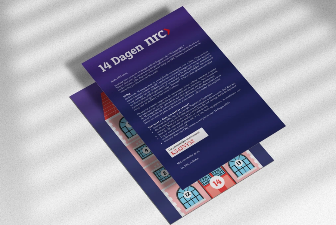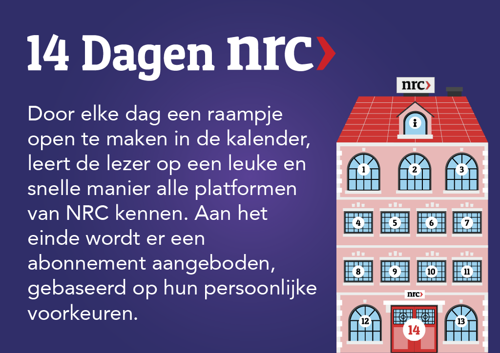 Als nieuwe abonnementhouder van het NRC krijgt men toegang tot 14 Dagen NRC een digitale kalender die in de NRC-app te vinden is. Door elke dag een raampje open te maken in de kalender, leert de lezer op een leuke en snelle manier alle platformen van NRC kennen. In het raampje zit een verassing, dit kan een nieuw platform zijn, maar ook korting, of een presentje. Na elke verassing wordt de lezer gevraagd een beoordeling te geven doormiddel van emoticons.