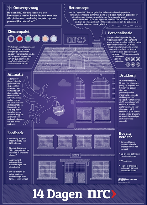 Uiteindelijk bleek toch de onboarding hen het meest aan te spreken en is er besloten om verder te gaan met 14 Dagen NRC. De feedback die we kregen zorgde ervoor dat we van een van de andere concepten konden combineren met 14 Dagen NRC. Dit bleek uiteindelijk de beste keuze geweest te zijn omdat de opdrachtgever ons idee tot beste idee hebben uitgeroepen.
